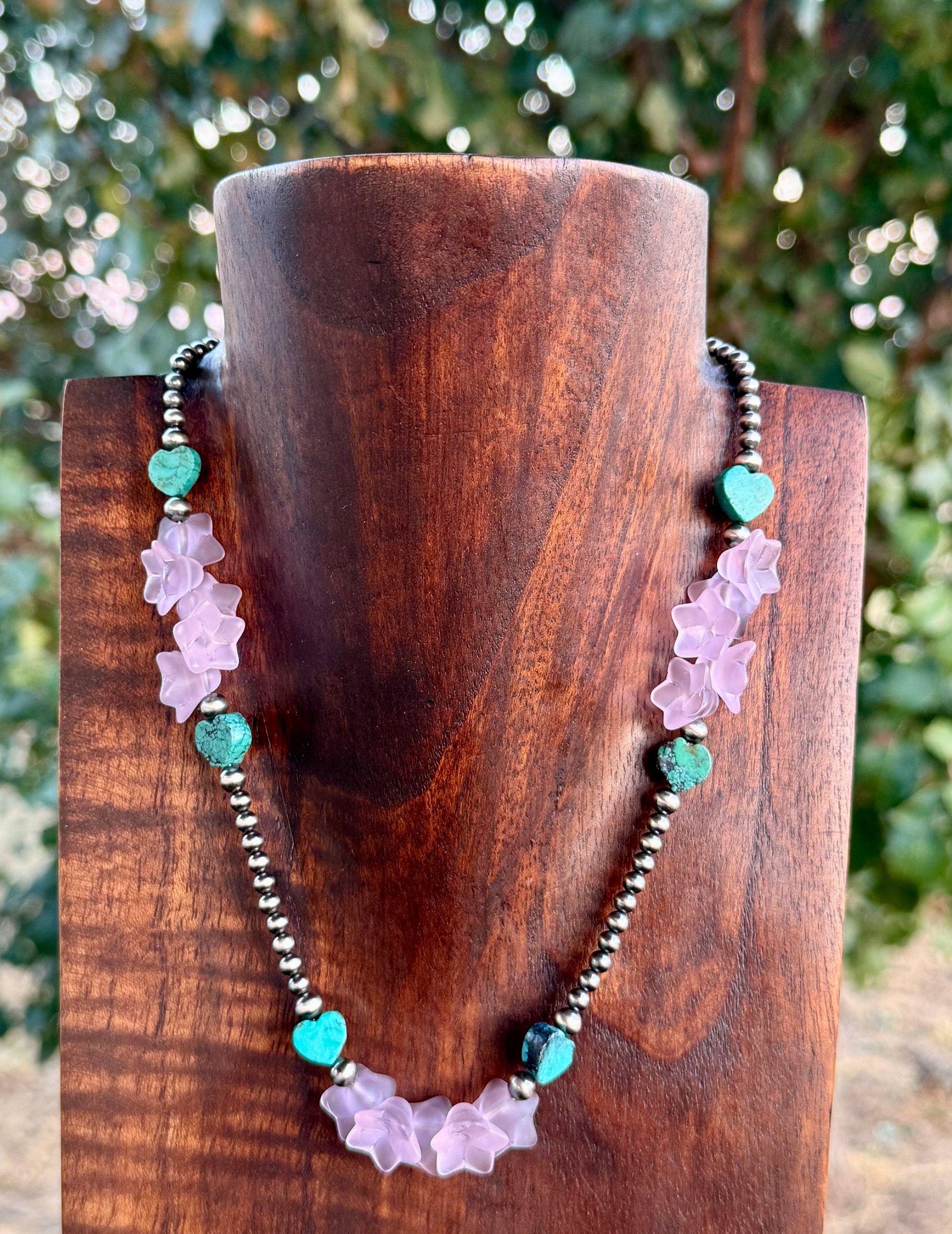 - Turquoise Hearts with Flowers (plastic beads)with 4 & 5 MM Sterling Silver Pearls