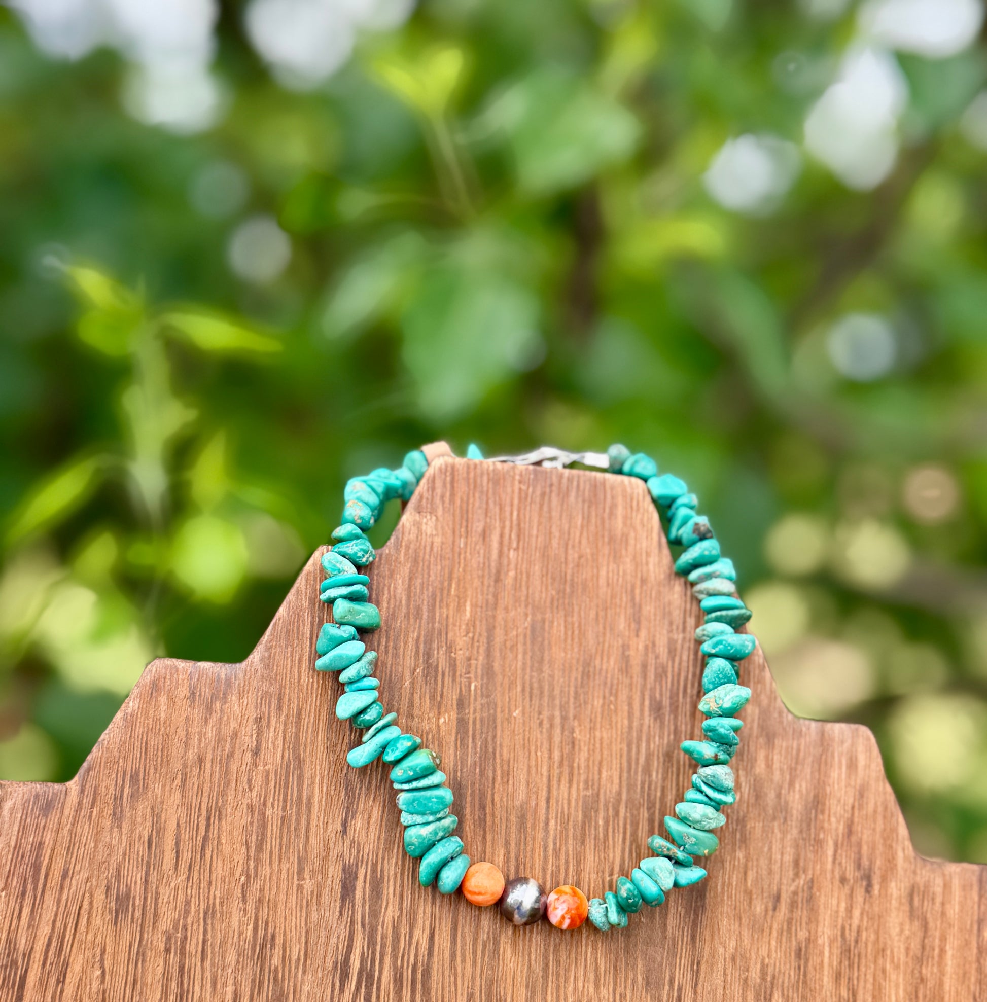 - Turquoise and Orange Spiny with 8 mm sterling silver pearls